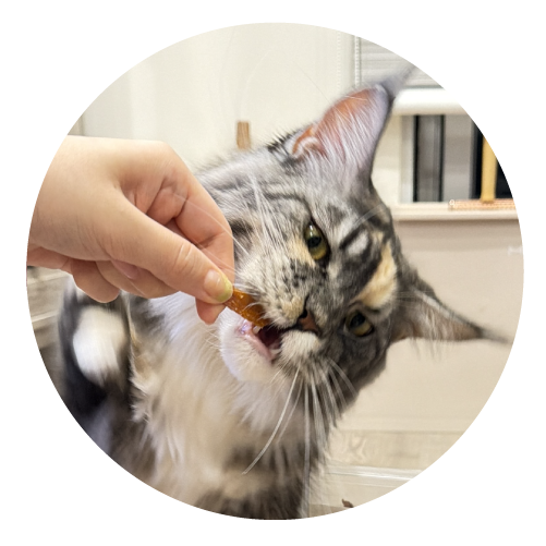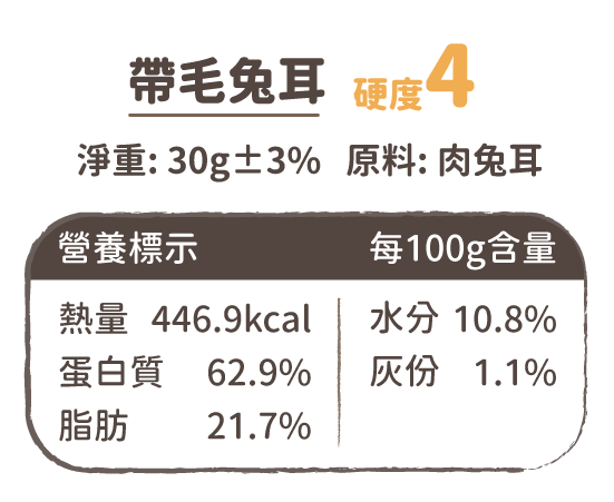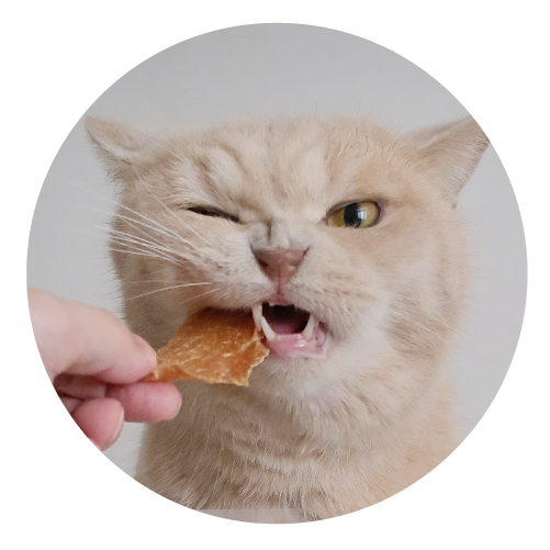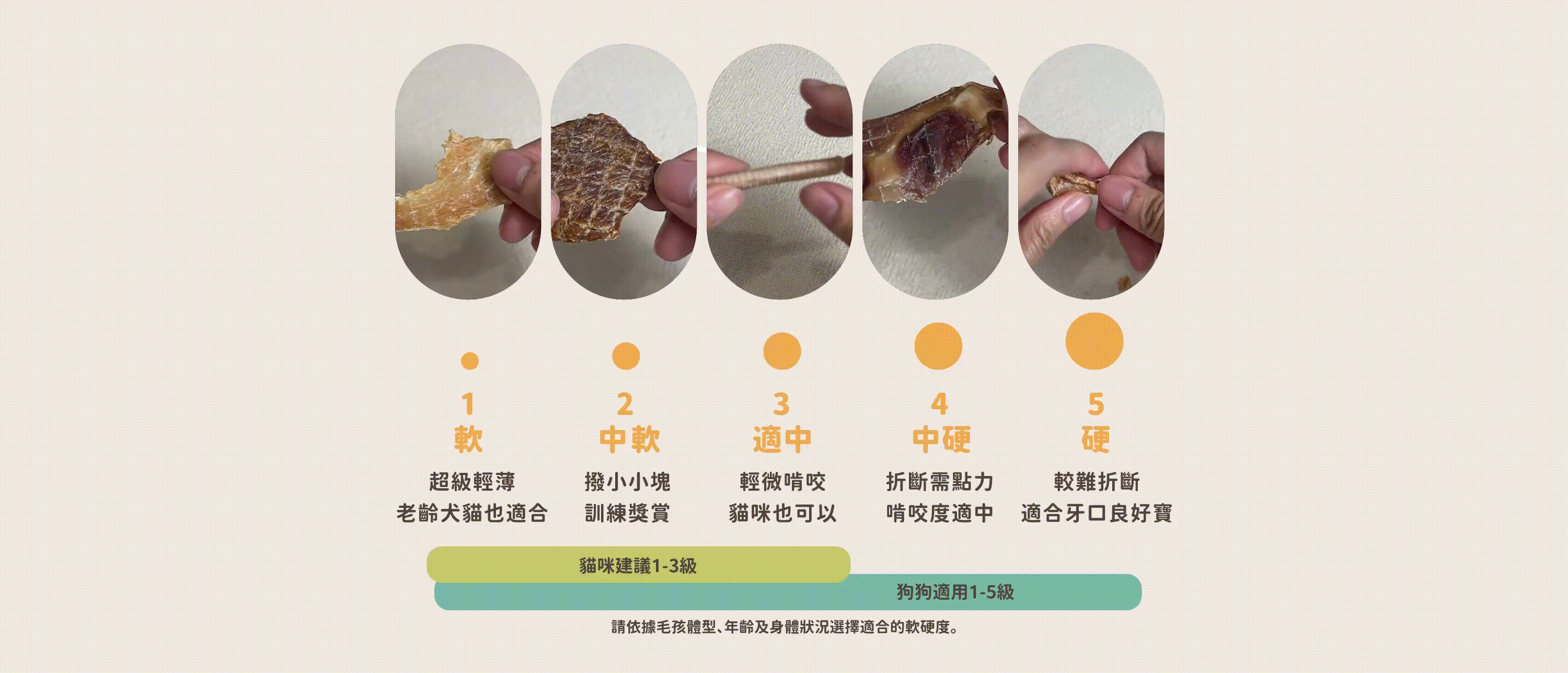 除了狗狗以外也非常適合貓咪吃唷,貓咪硬度建議選擇1-3級即可,可以從硬度最低的肉肉開始嘗試,一開始可以先剝撕或剪切小塊餵食,習慣後可以嘗試整塊哦!建議毛爸媽餵食時要陪同並觀察進食狀況。