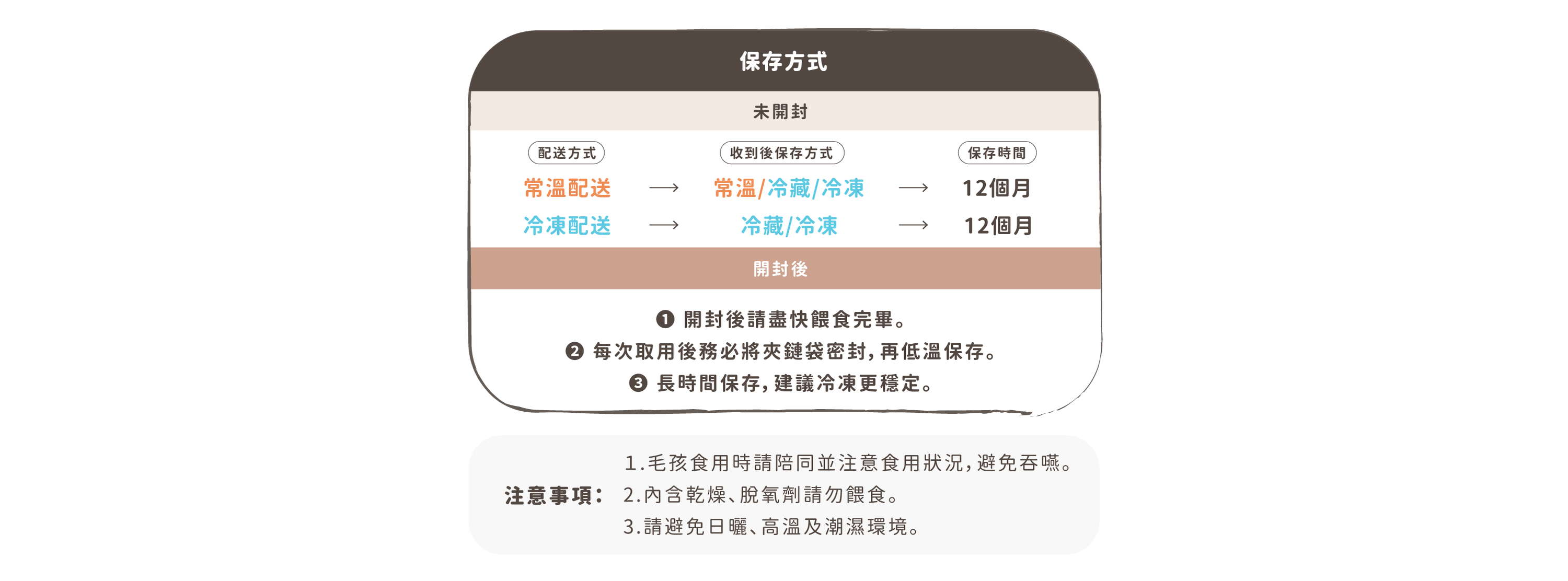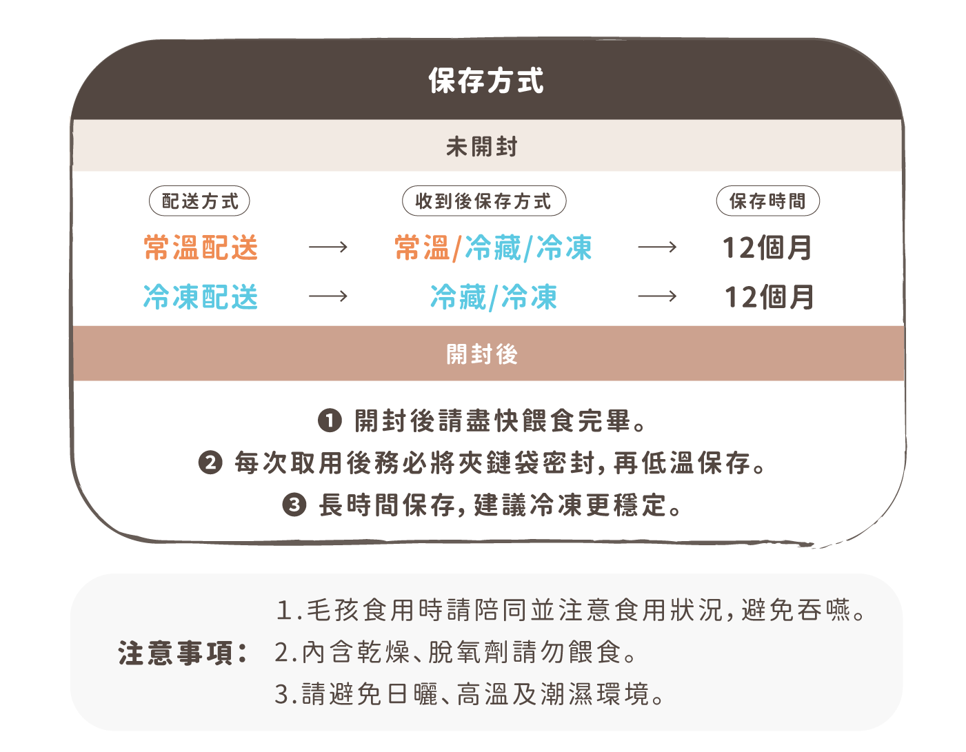 ➊常溫配送:未開封前可於陰涼乾燥處常溫保存,也請避免日曬、高溫及潮濕的環境;開封後建議使用原包裝夾鏈袋或氣密罐密封常溫保存(低溫保存更佳),並儘早餵食完畢以確保零食新鮮不受潮。