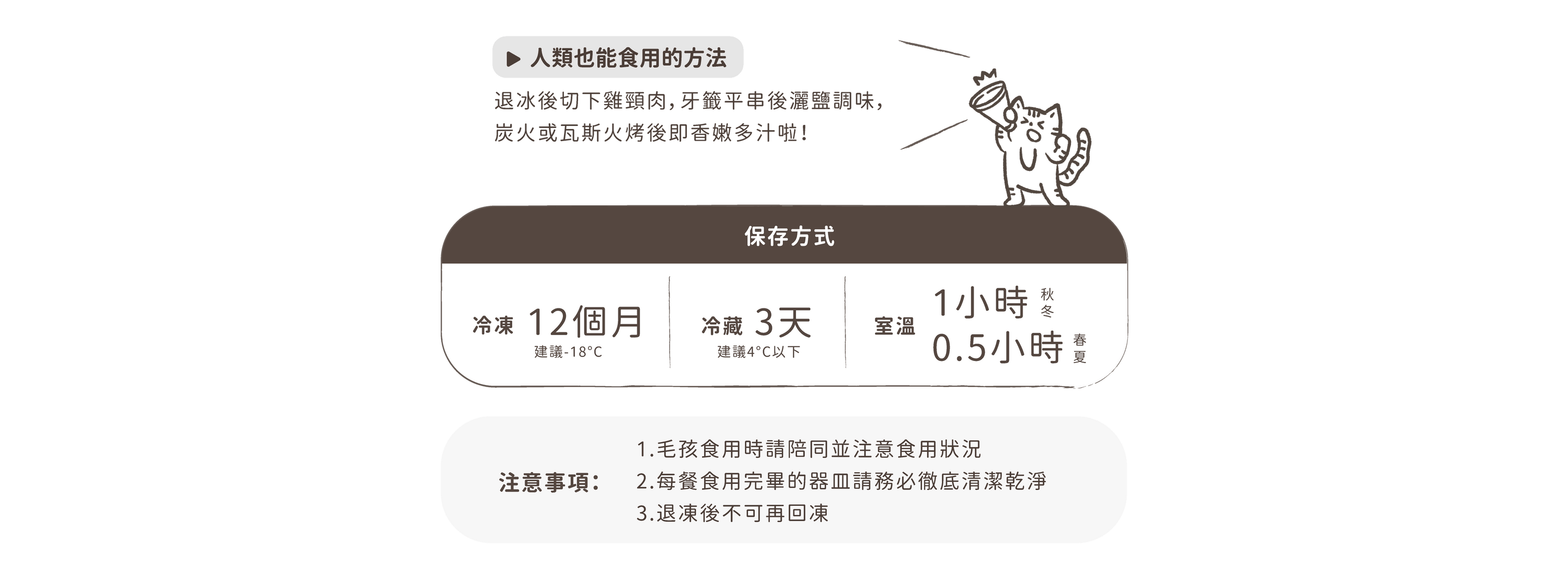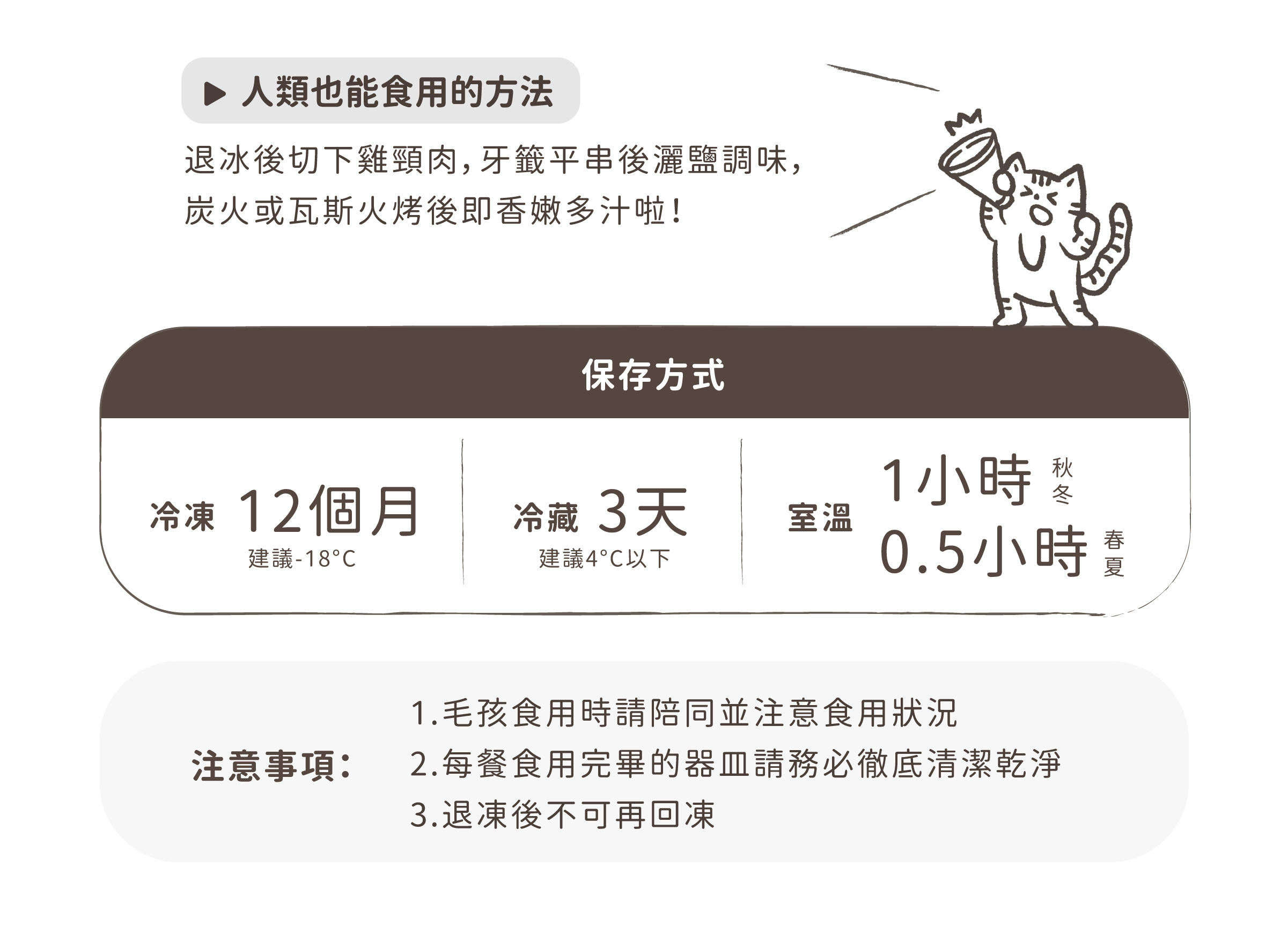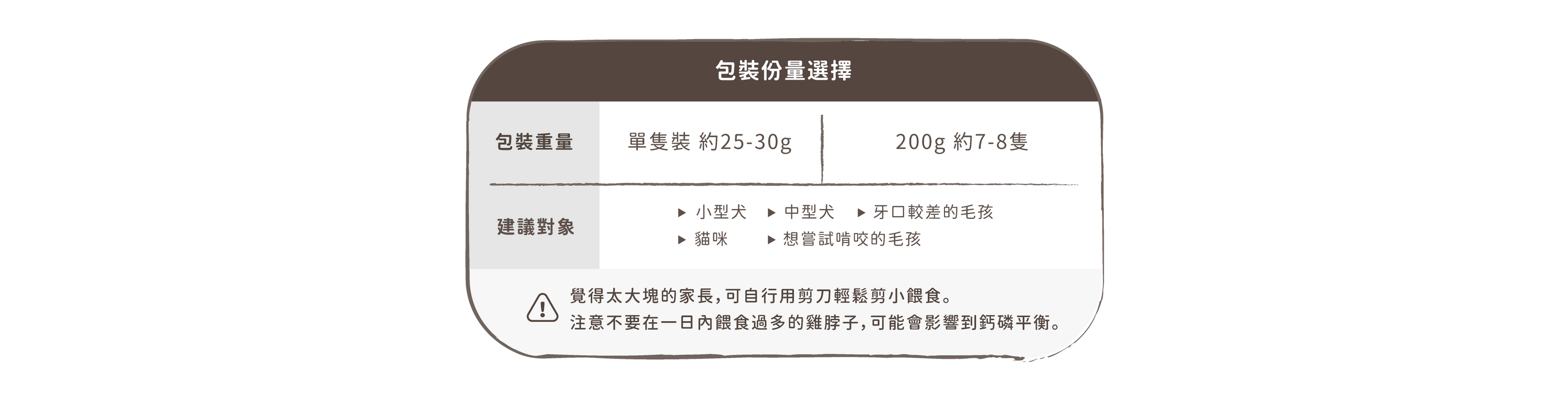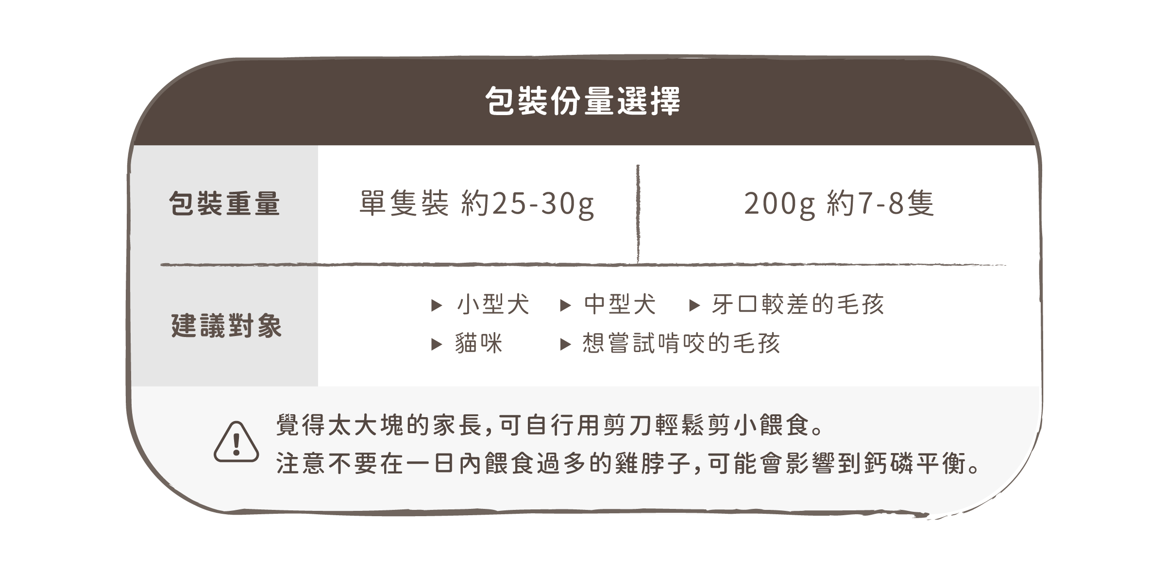 因雞脖子為圓柱狀,部分犬貓如果平時習慣吞食,有可能會造成咽喉堵塞,家長務必陪同進食,預防毛孩吞食!