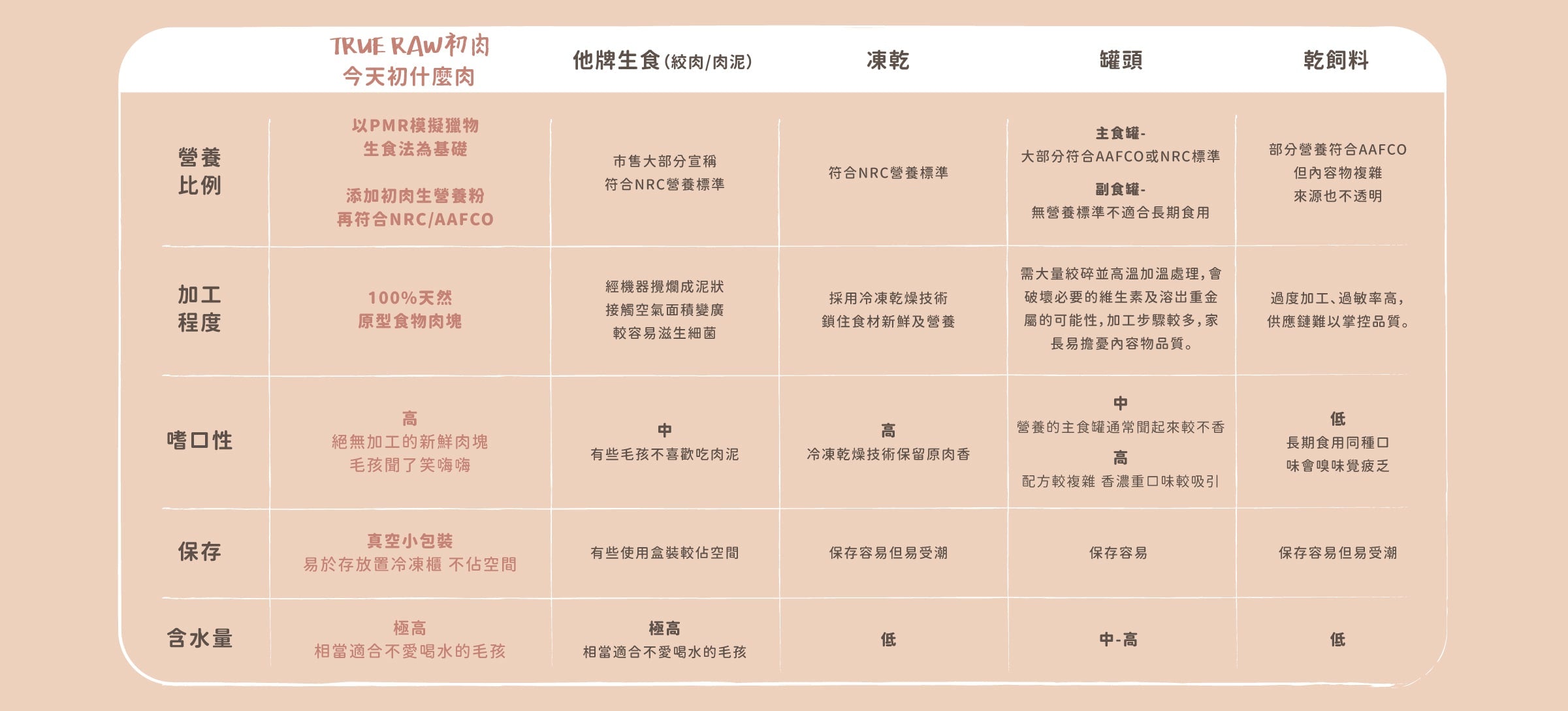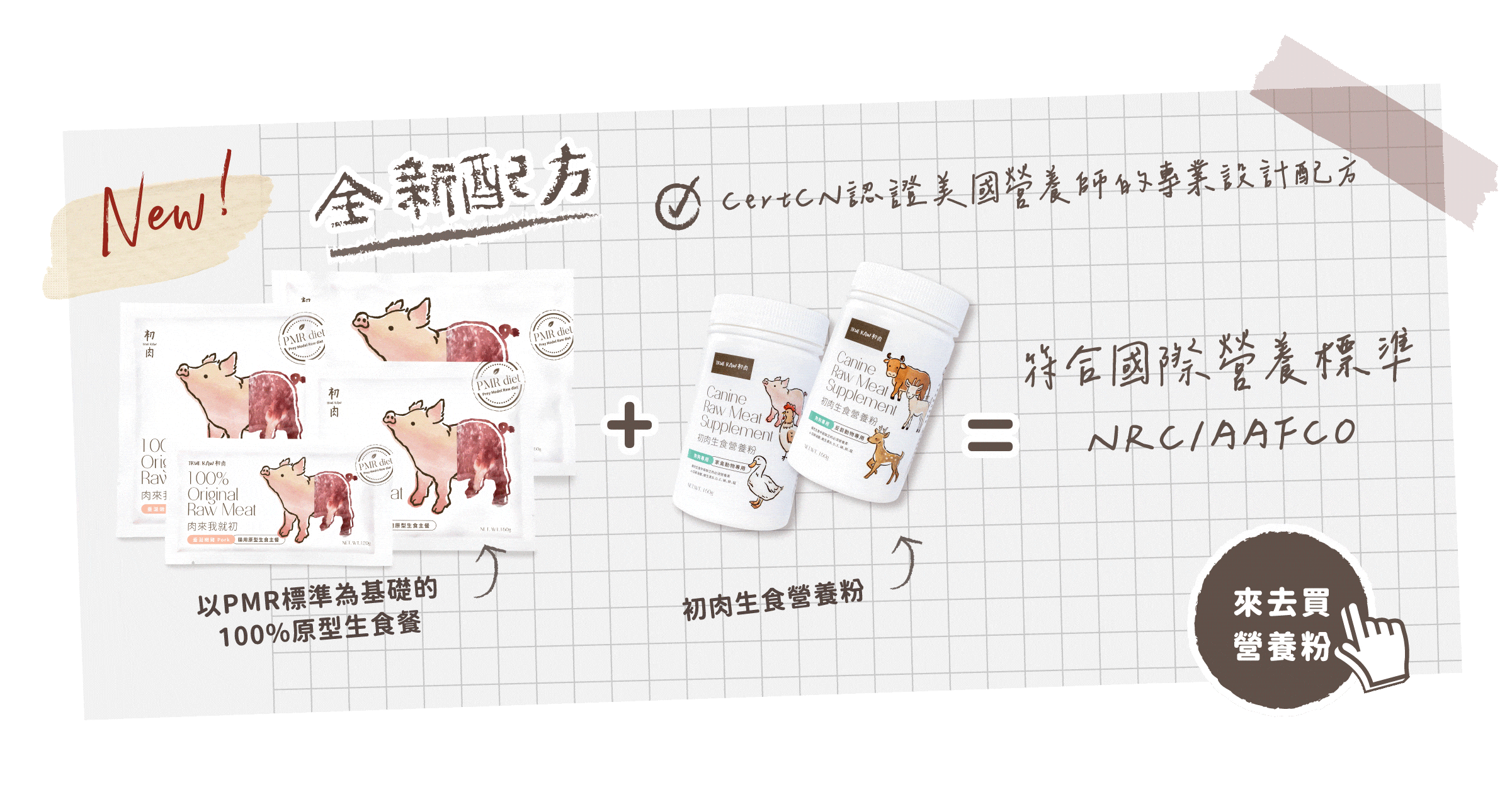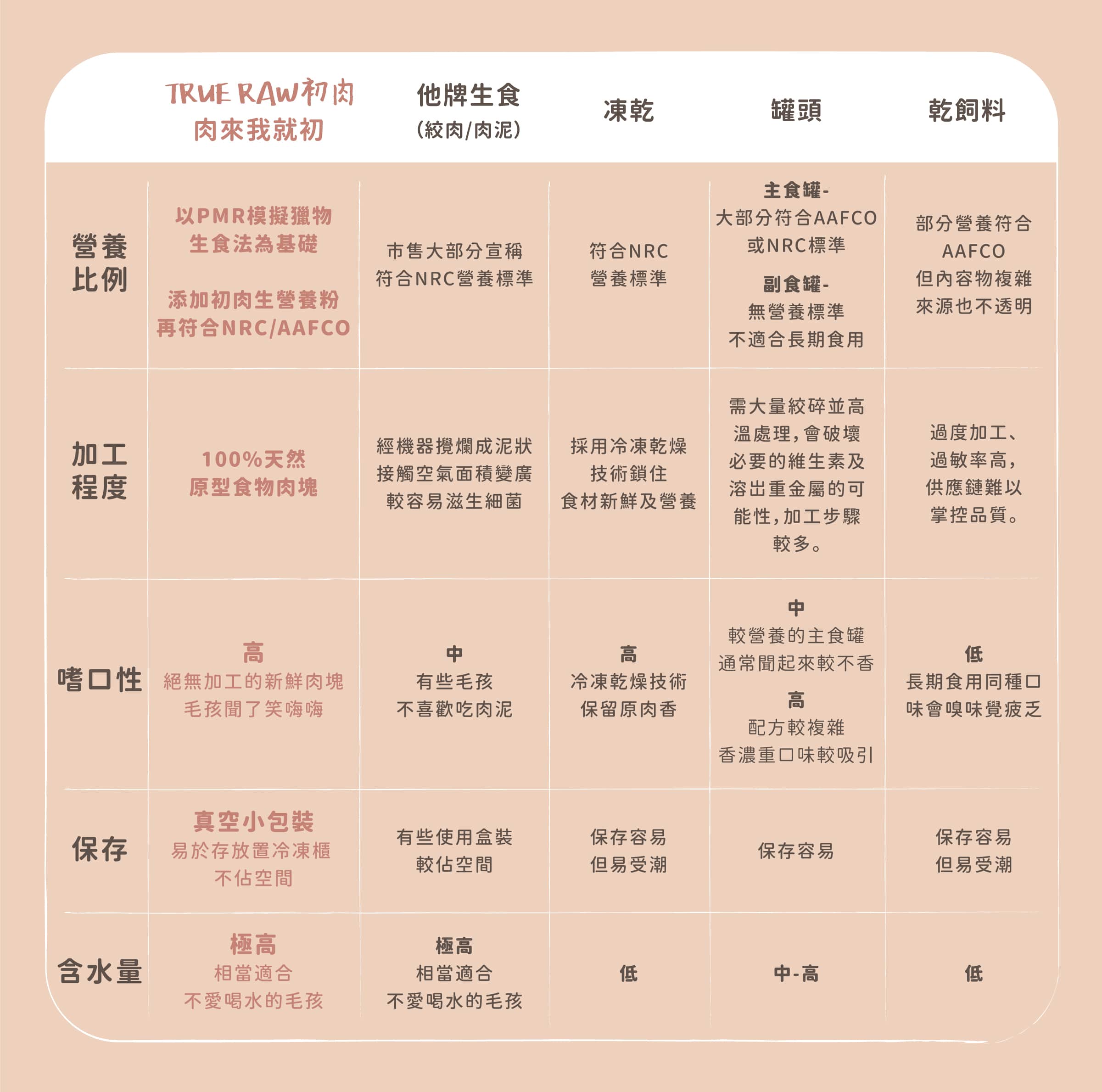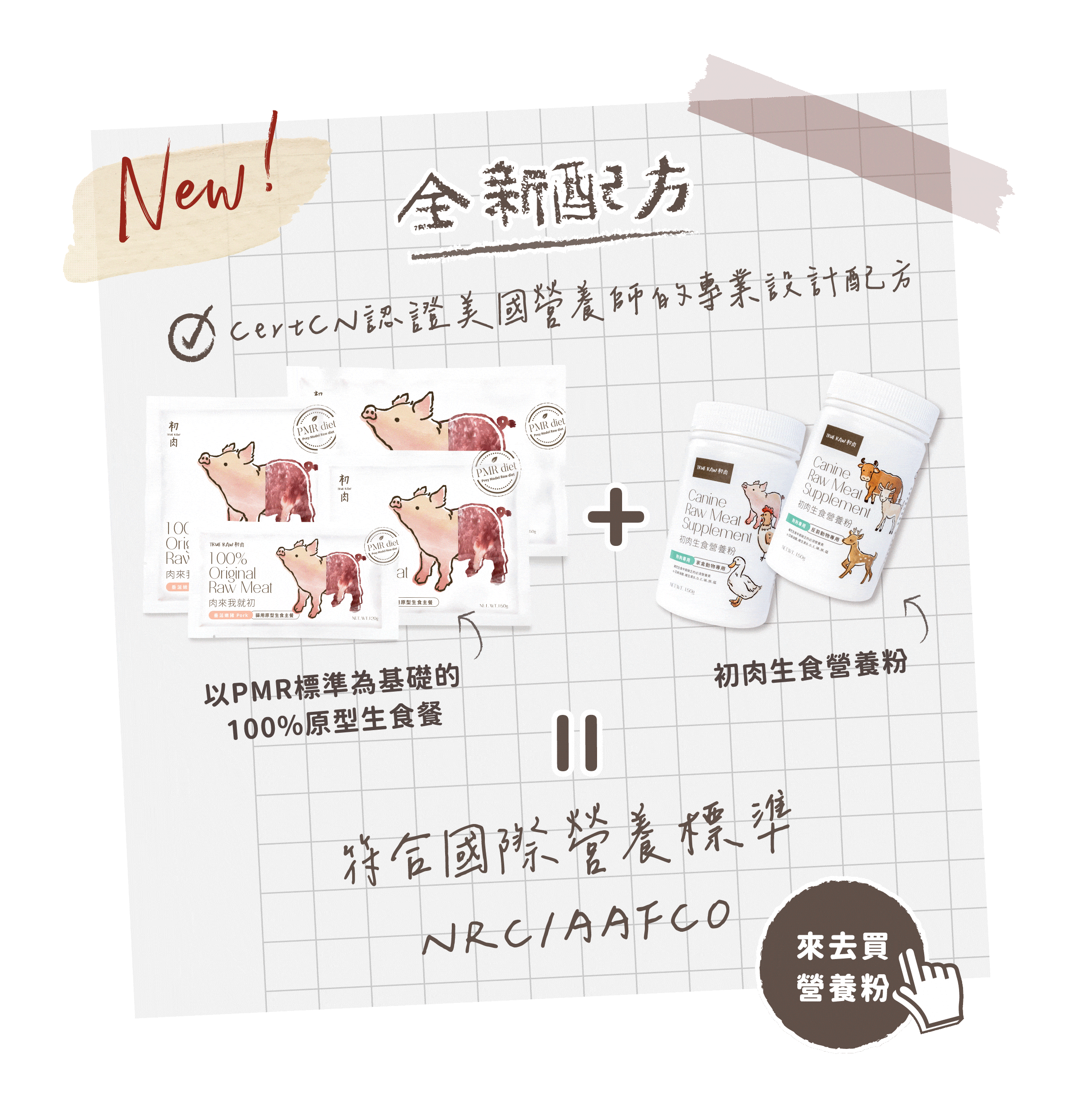 採自PMR完全模擬獵物生食法為基礎,由CertCN認證的美國寵物營養師設計配方,追求動物最原始的營養來源-原型生肉, 符合國際營養標準NRC/AAFCO,專屬毛孩的「天然原型」均衡飲食方式。