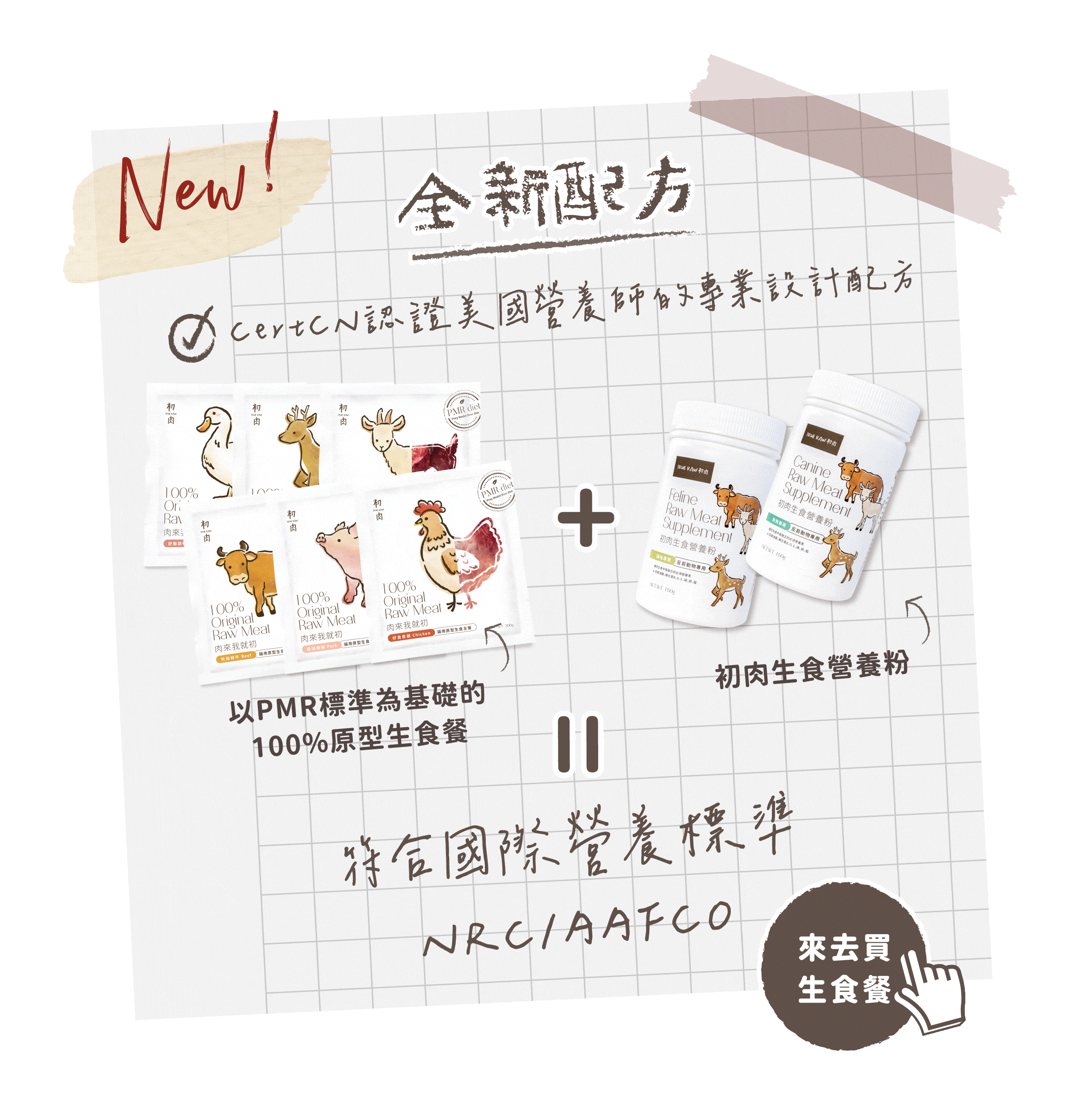 由CertCN認證的美國寵物營養師設計配方,搭配初肉原型生食餐即符合NRC/AAFCO,追求動物最原始的營養來源-動物生肉,專屬毛孩的均衡飲食方式。