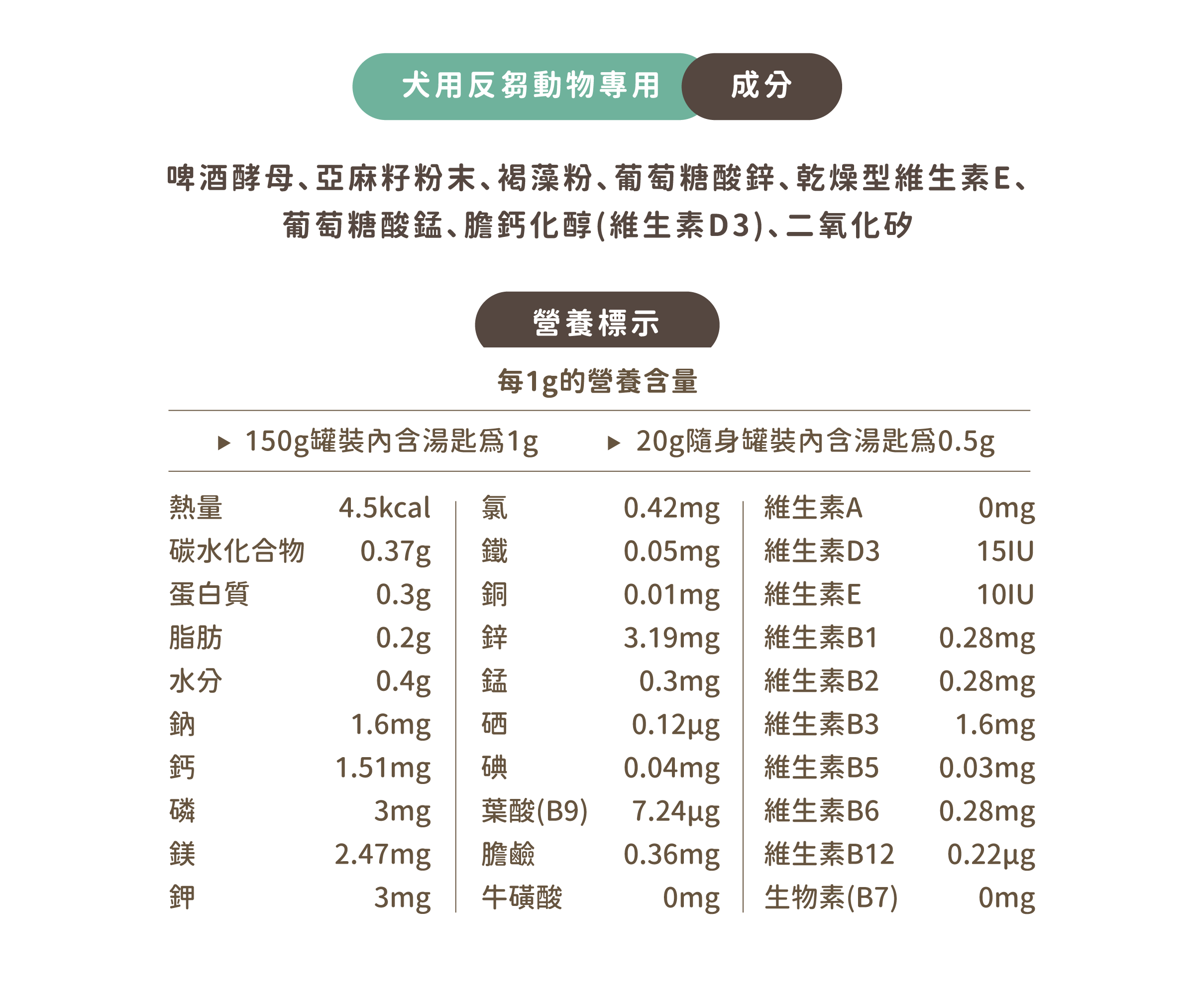 每一克褐藻粉約含有0.65mg的碘,能幫肋動物合成甲狀腺激素,調節生理代謝,是全肉生食中較易缺乏的重要角色。